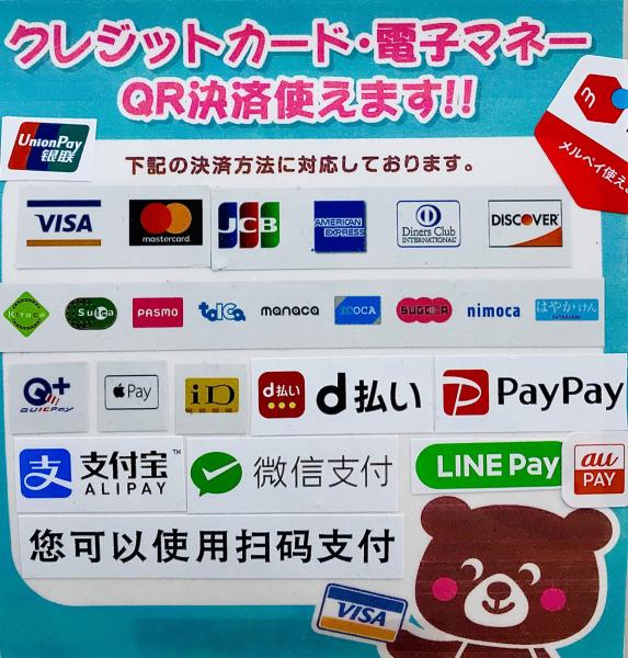 銀聯カード他、各種クレジットカード、電子マネー、QRコード決済可能です